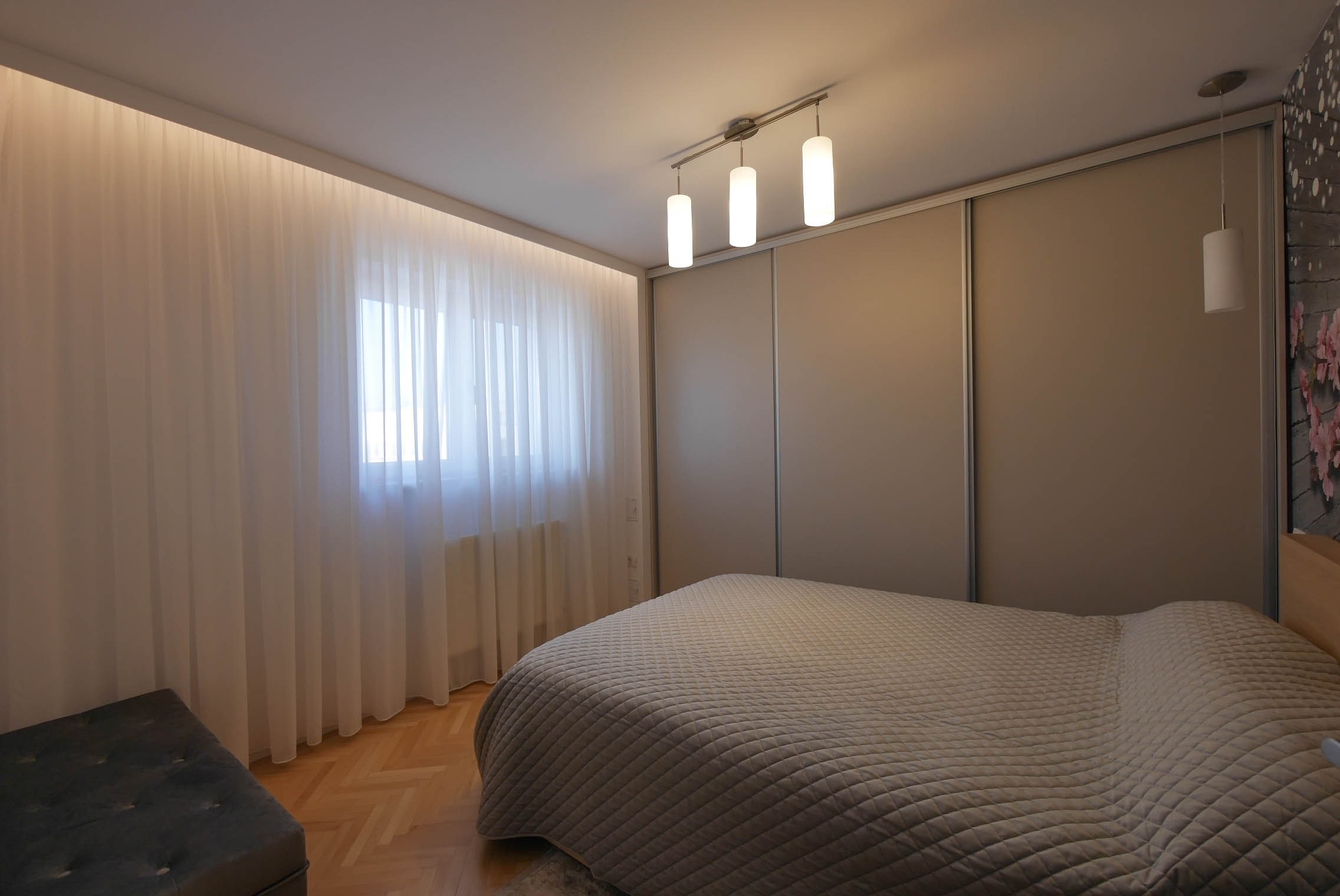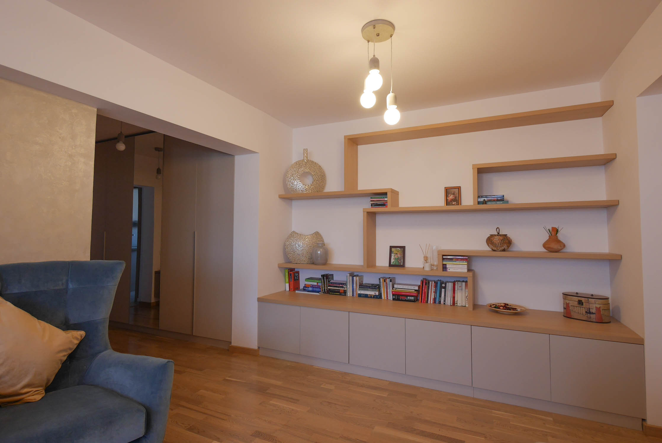 Tapetul evocă peisaje naturale abstractizate, contribuind la senzația de amplificare a spațiului real. Mobilierul din zona de zi individualizează două zone esențiale – sufrageria și salonul – prin placaje parietale rafinate. Biroul este conceput ca o metaforă pentru libertatea și bucuria de a lucra sau studia, în timp ce dormitorul matrimonial impresionează prin combinația de materiale naturale și contrastul cromatic dintre tapetul misterios și nuanțele deschise ale mobilierului, oferind un spațiu relaxat, dar elegant.