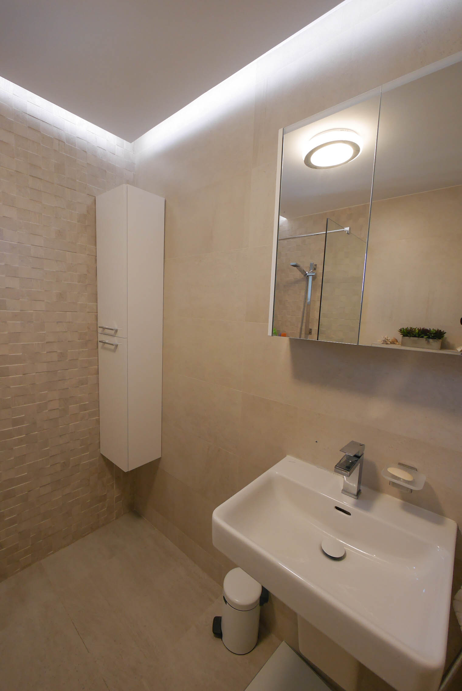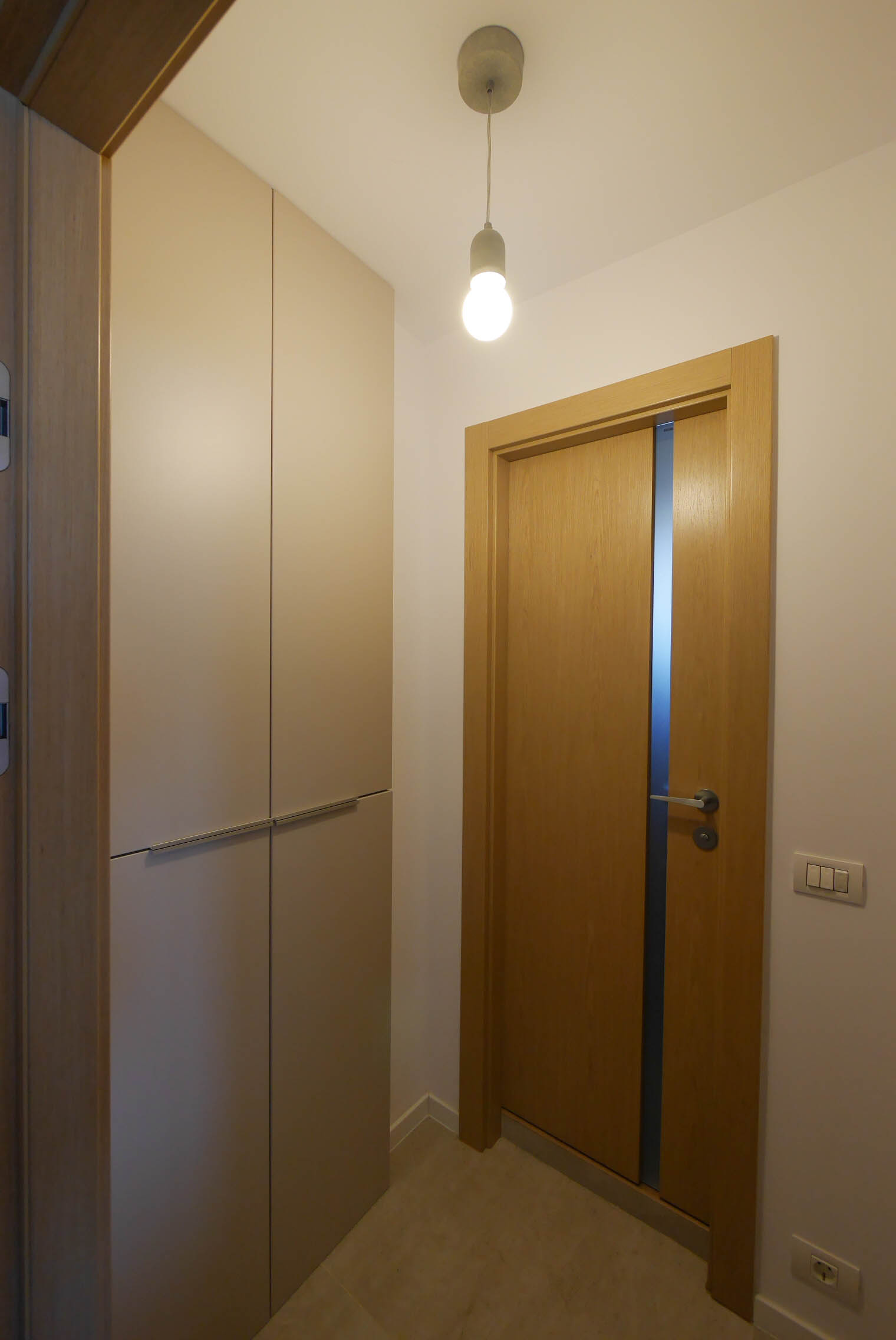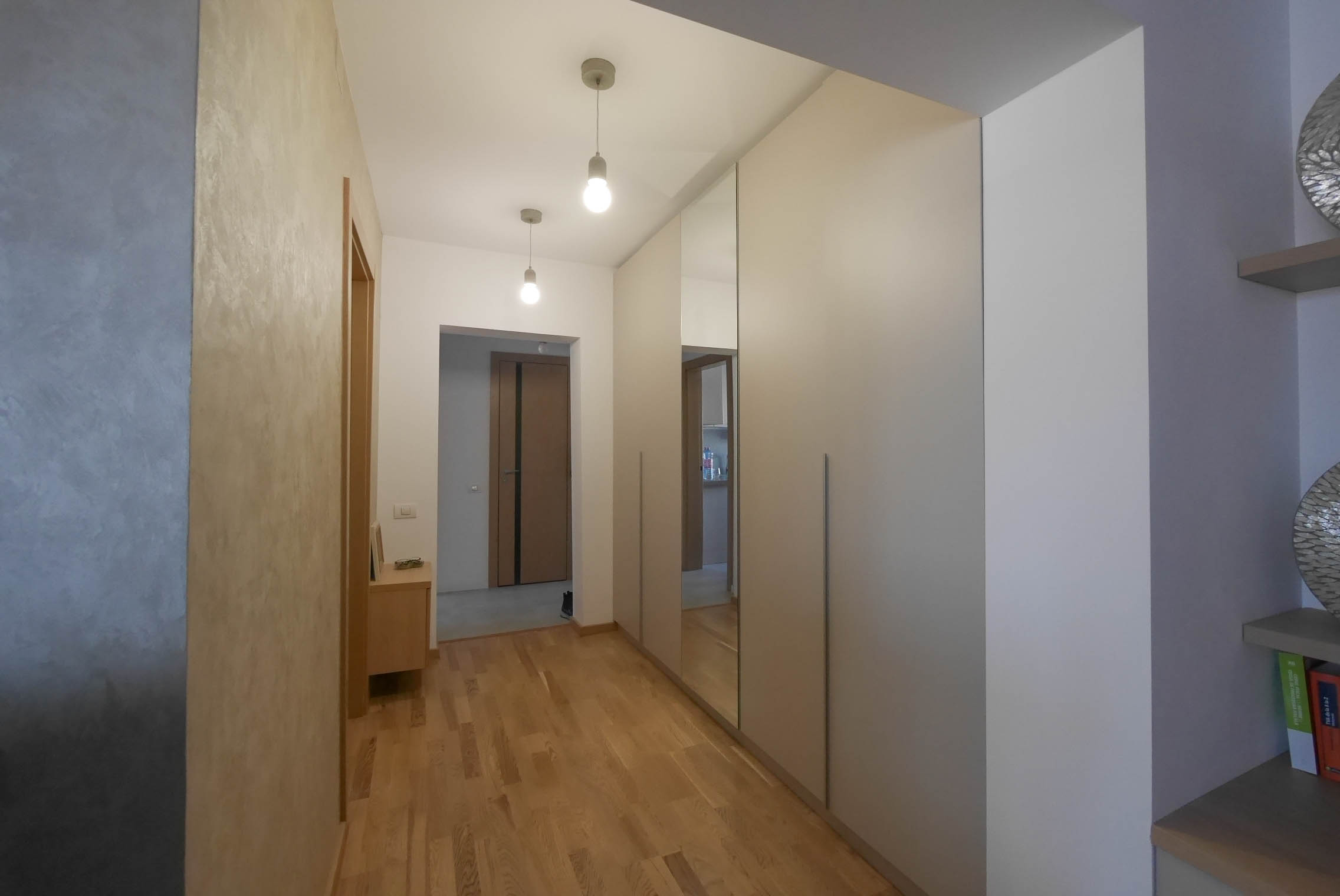 Apartamentul, având un spațiu limitat și incapabil de extinderi ulterioare, este amplificat vizual printr-o serie de soluții inovatoare. Tapetele propuse evocă un univers vast, deschizând perspectiva spațiului. În plus, mobilierul încastrat în pereți eliberează pardoseala, creând o senzație de aerisire și fluiditate. Paleta cromatică, dominată de tonuri pastelate și alb, se completează cu furnirul deschis la culoare, din lemn de mesteacăn, arțar, paltin și păr, care adaugă un plus de luminozitate și căldură. - Crearea unei ambianțe care depășește cadrul spațial al încăperilor