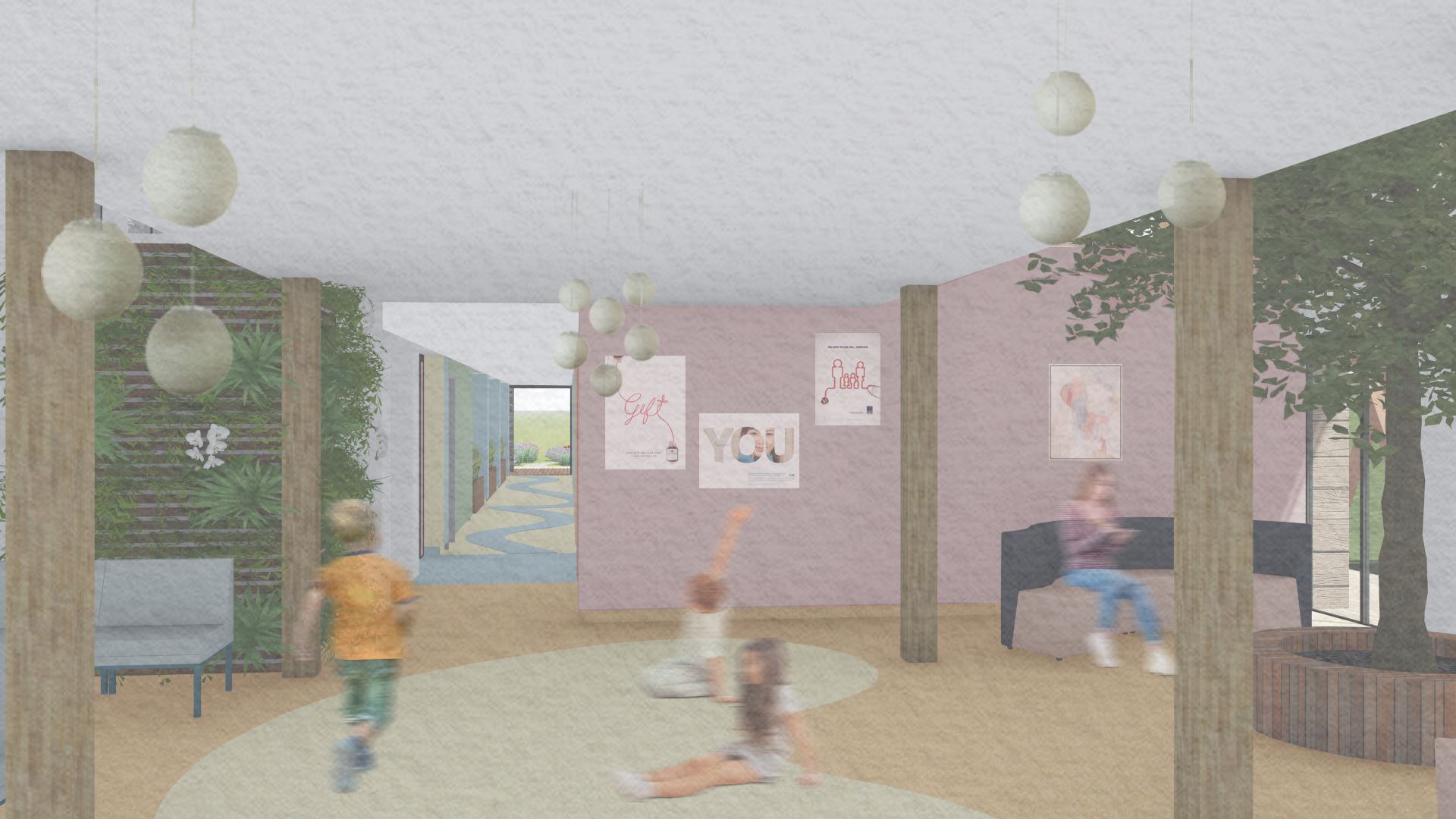 La interior, în spațiul pe dublă înălțime, este amplasat un arbore decorativ care creează distragerea pozitivă și care, alături de un perete plantat, conturează un design biofil, centrat pe pacient. În sala de așteptare este amenajat și un loc de joacă pentru copii care încurajează socializarea, scurtează timpul necesar preluării pacienților și contribuie la ameliorarea simptomelor prin concentrarea pozitivă în zona ludicului.