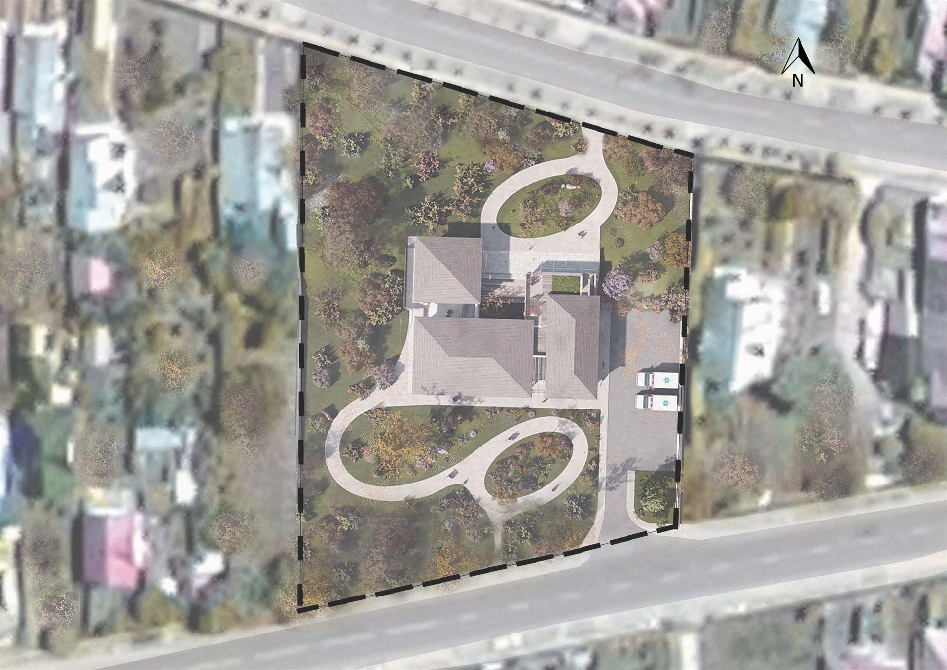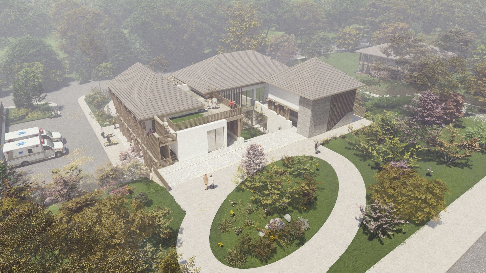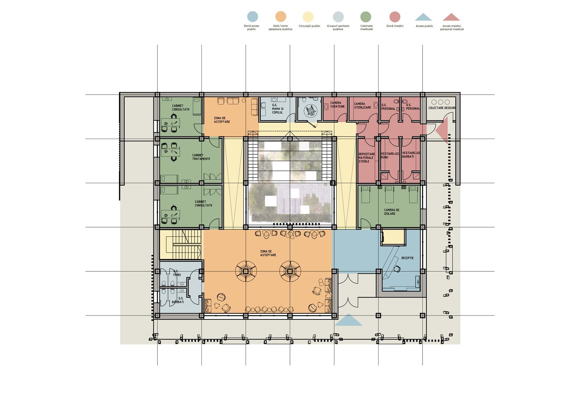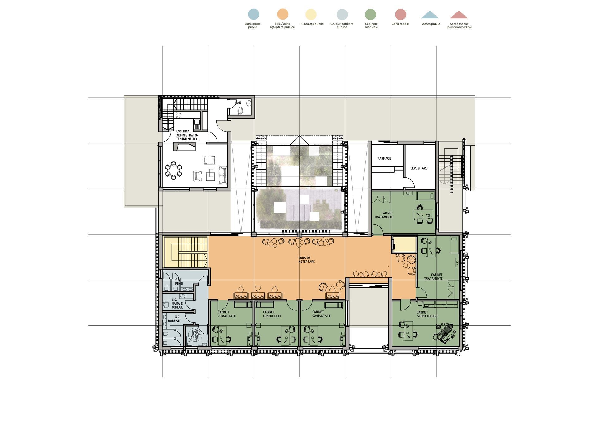 Proiect dispensar medical uman în mediul rural, cu 4 cabinete de consultație, 3 săli de tratament, 1 cabinet de izolare, 1 cabinet stomatologic și zonă de joacă pentru copii în curtea interioară, cu grădină terapeutică (2024)